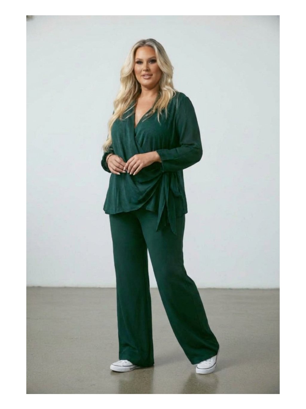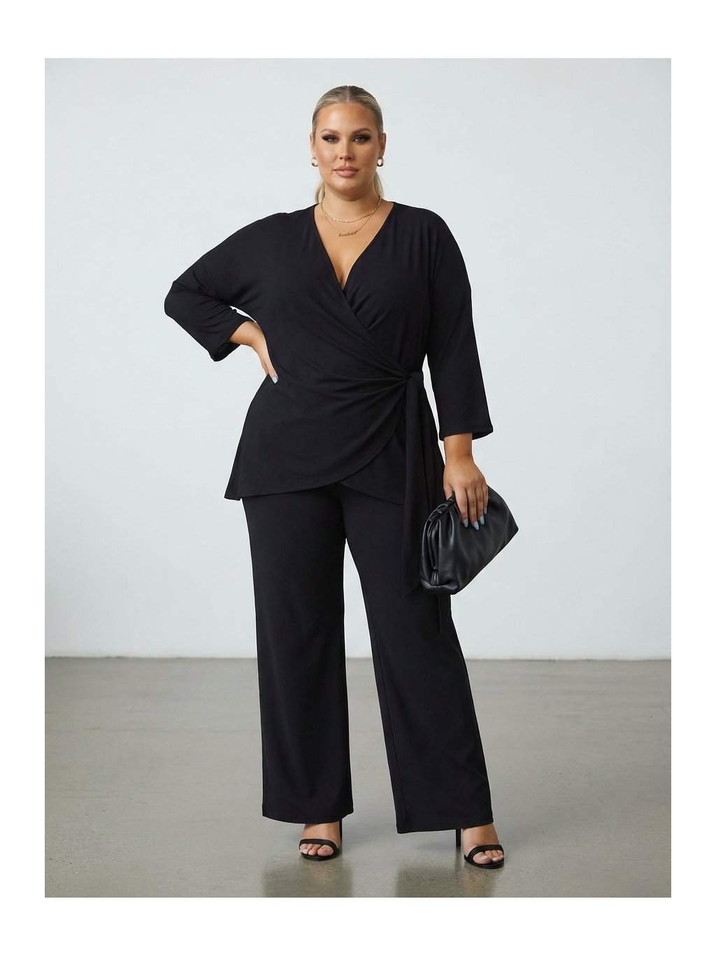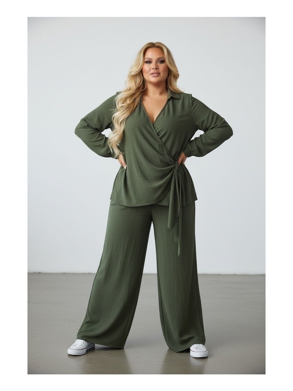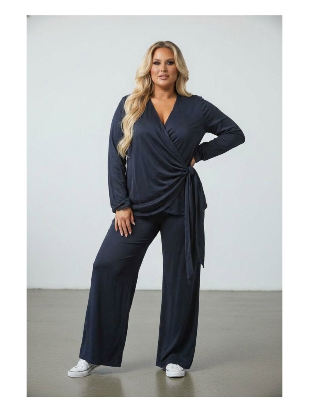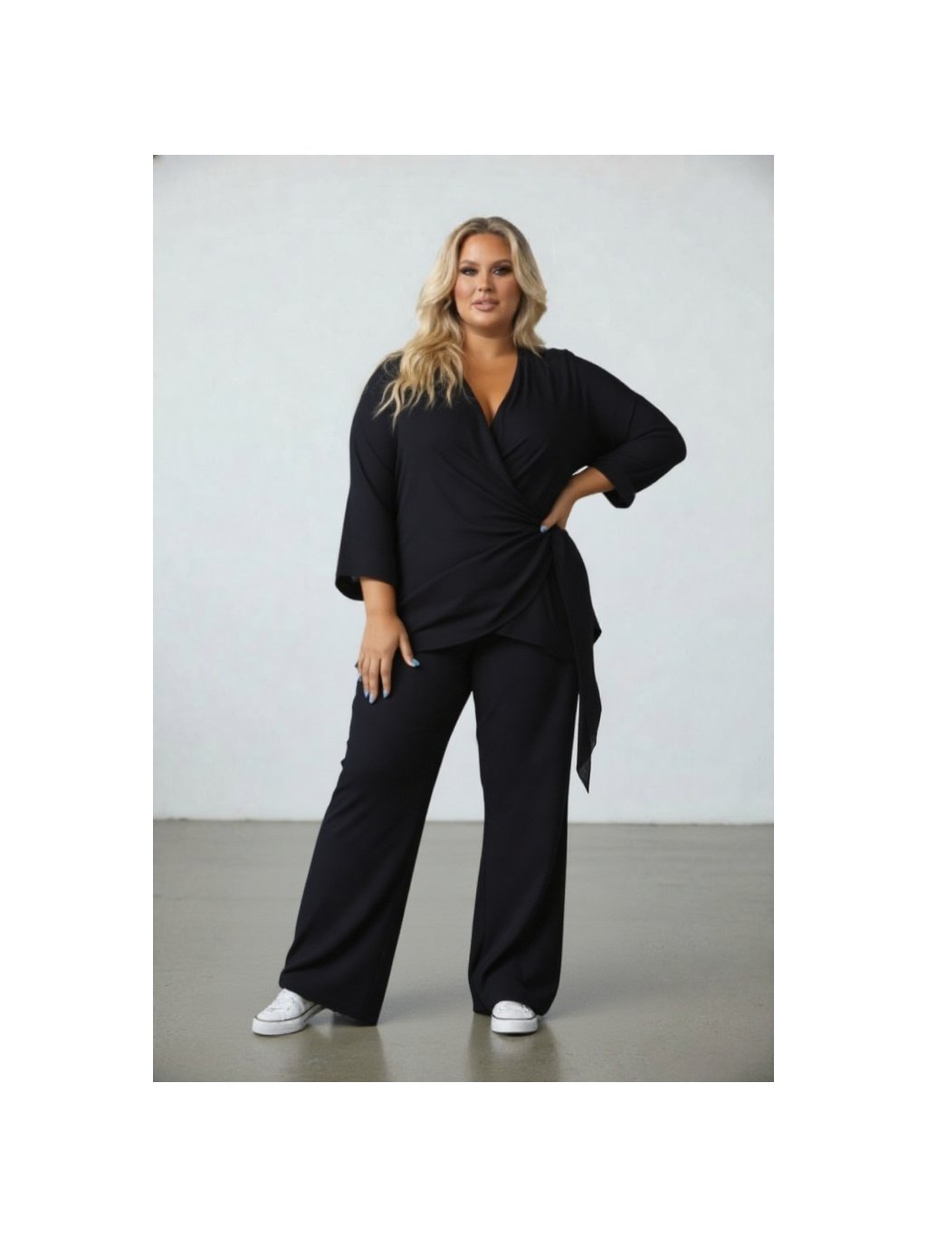 Stylový a pohodlný komplet, který si zamilujete! Horní díl má zavinovací střih s elegantním ukončením do poutka na boku, který krásně zvýrazní siluetu. Rukávy jsou zakončené jemnou gumičkou, takže drží na místě a nepřekážejí. Kalhoty mají volný střih s pružným pasem.Jsou bez kapes.