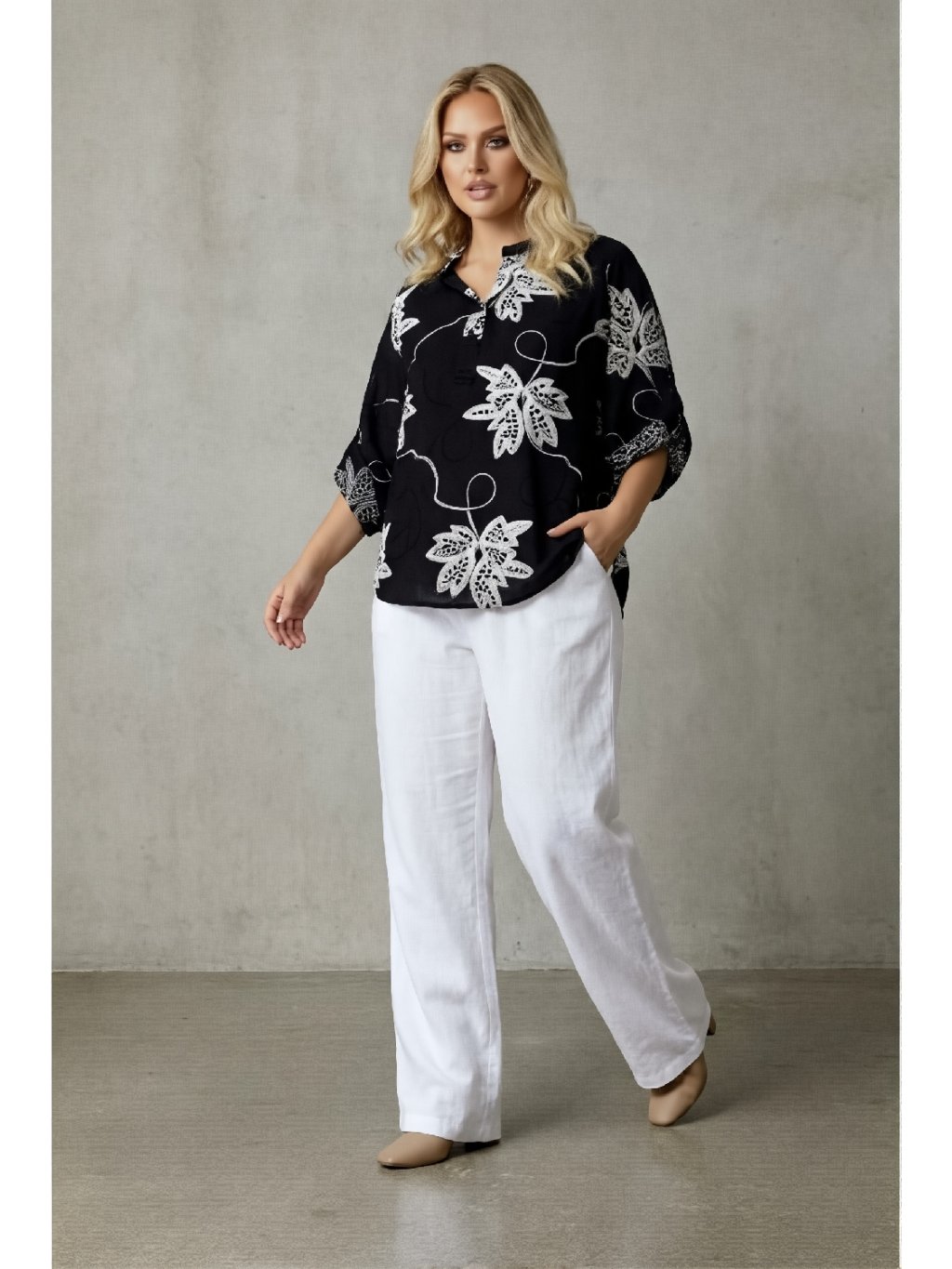 Elegantní košile v černé barvě zdobená jemnou bílou květinovou výšivkou. Výstřih do "V", bez kapes, s čistým a sofistikovaným vzhledem. Perfektní volba pro ženy, které chtějí vyniknout. Velikost odpovídá cca konfekční 46 – řiďte se prosím rozměry v tabulce.