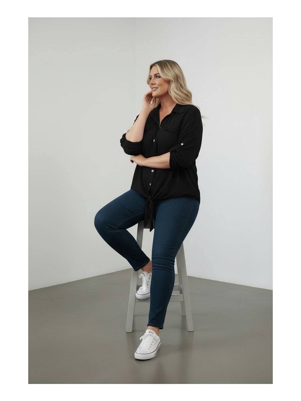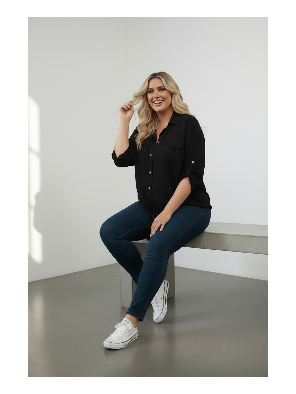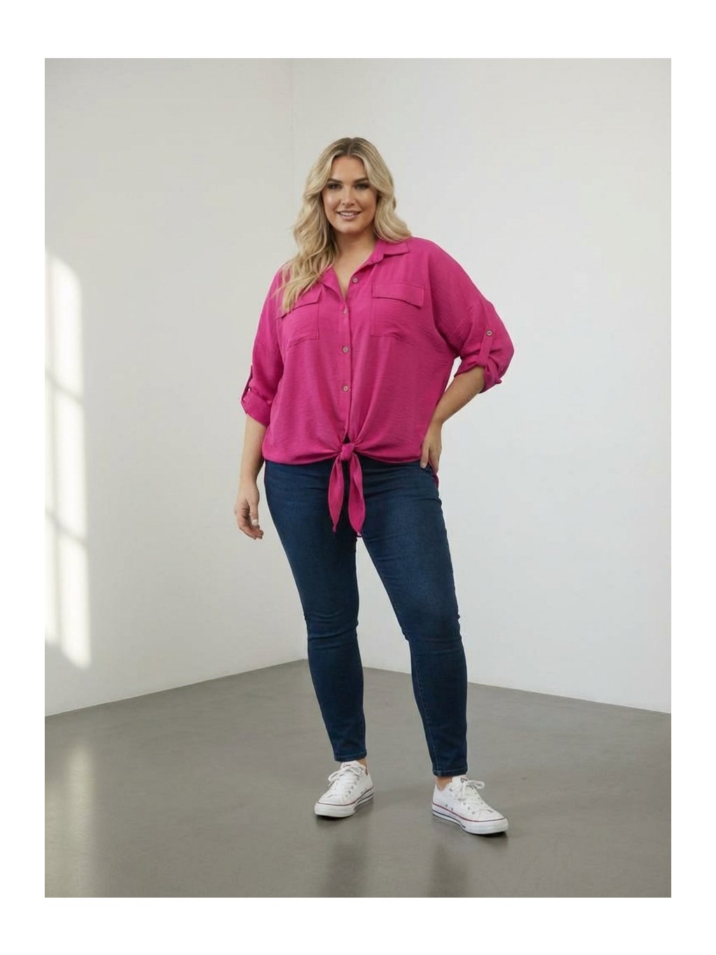 Košilová tunika s moderním a pohodlným střihem. Dolní obvod je zakončen efektním uzlem, který dodává modelu ležérní vzhled. Tunika je propínací na knoflíčky po celé délce a má rukávy typu roll-up, které lze snadno ohrnout a zajistit. Vyrobena z nemačkavého materiálu, ideálního pro každodenní nošení i cestování. Skvěle se kombinuje s džínami, legínami i elegantnějšími kalhotami (mrkněte do našeho oddělení kalhot a legín.