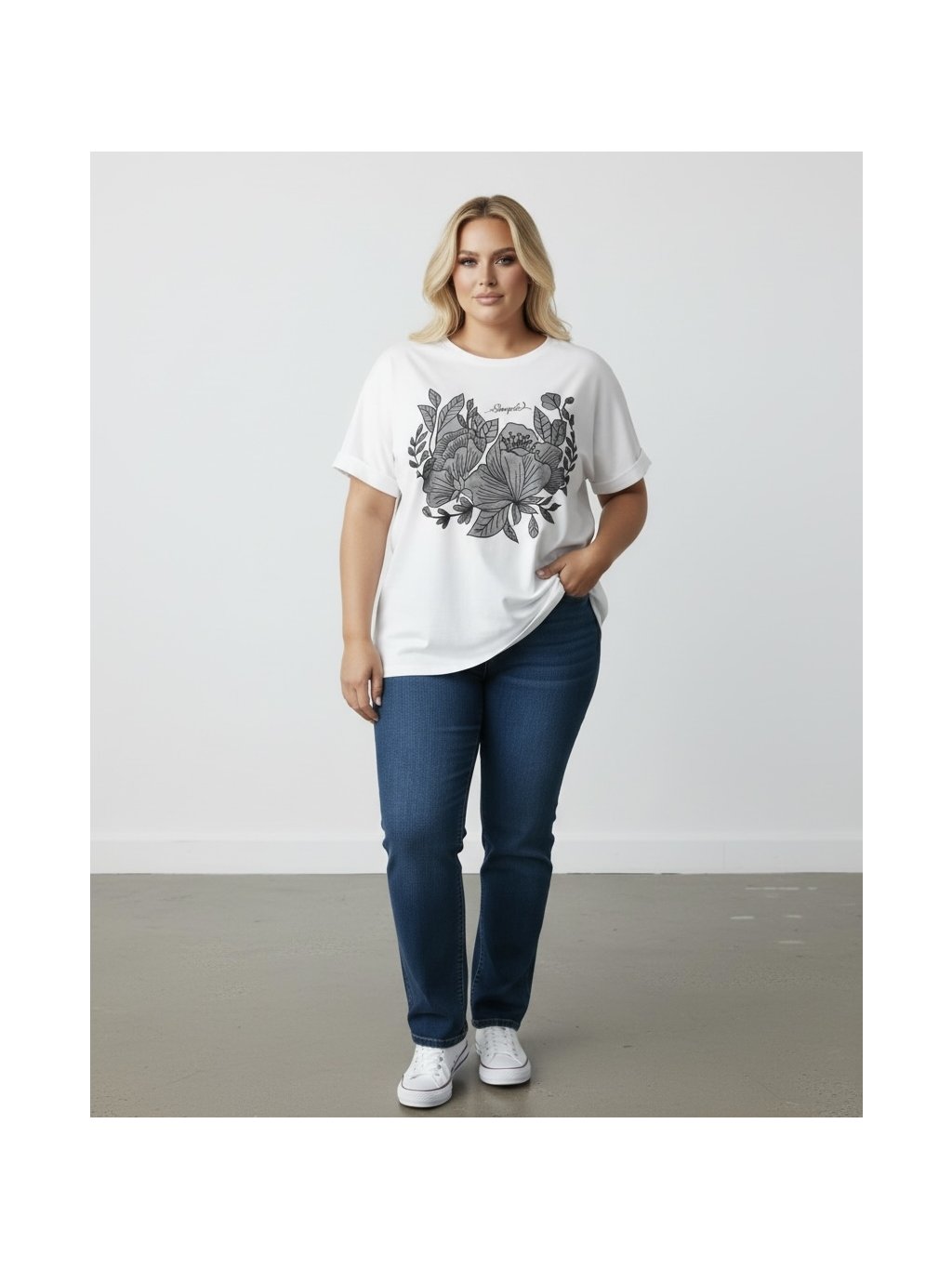 Elegantní tunika navržená s ohledem na plus size postavu. Kvalitní vyšívaná aplikace na předním dílu přidává šmrnc a ženskost. Dostupná ve dvou nadčasových barvách – černé a bílé – které lichotí každé siluetě.