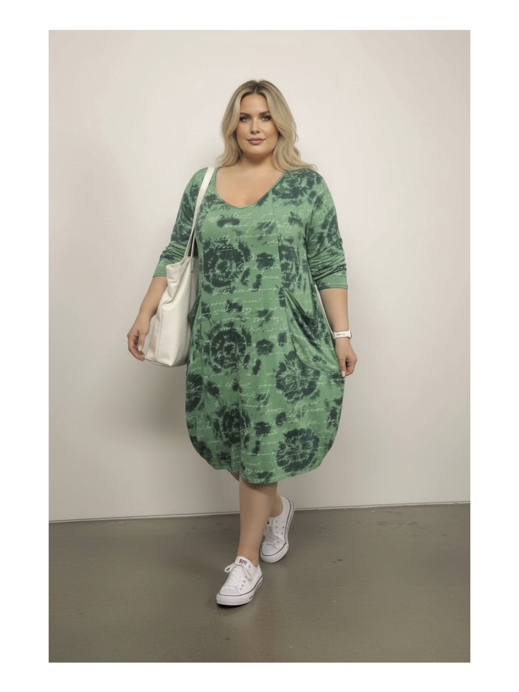 Modelka má míry přes hrudník 115 cm a přes boky 120 cm,výška 167 cm