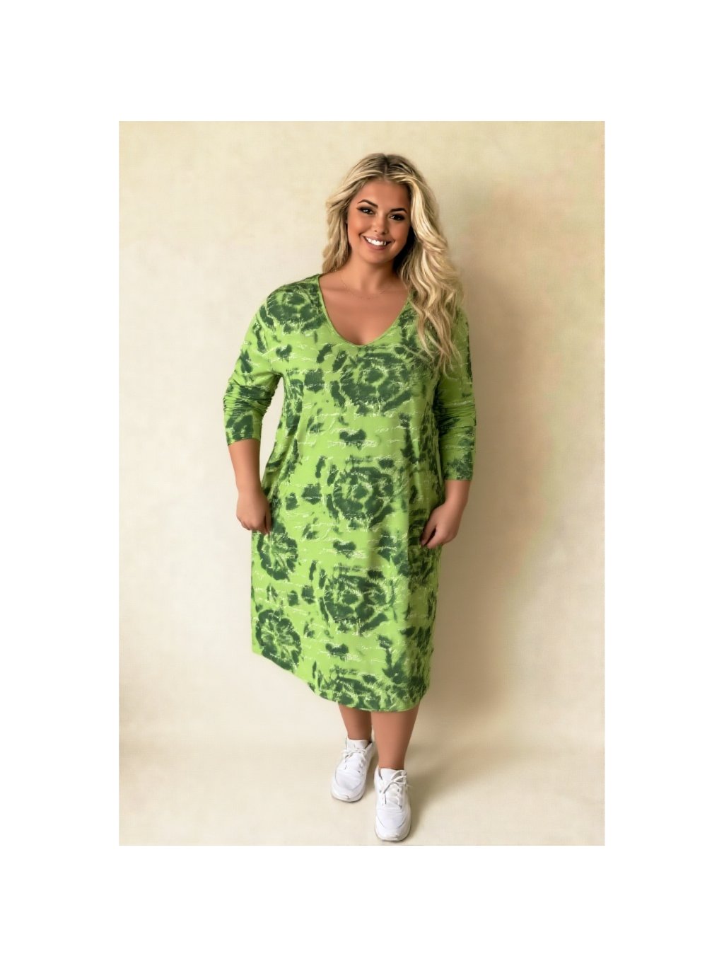 Střih šatů je klasického tvaru a předností je véčkový výstřih.