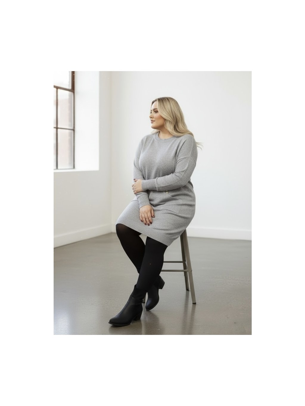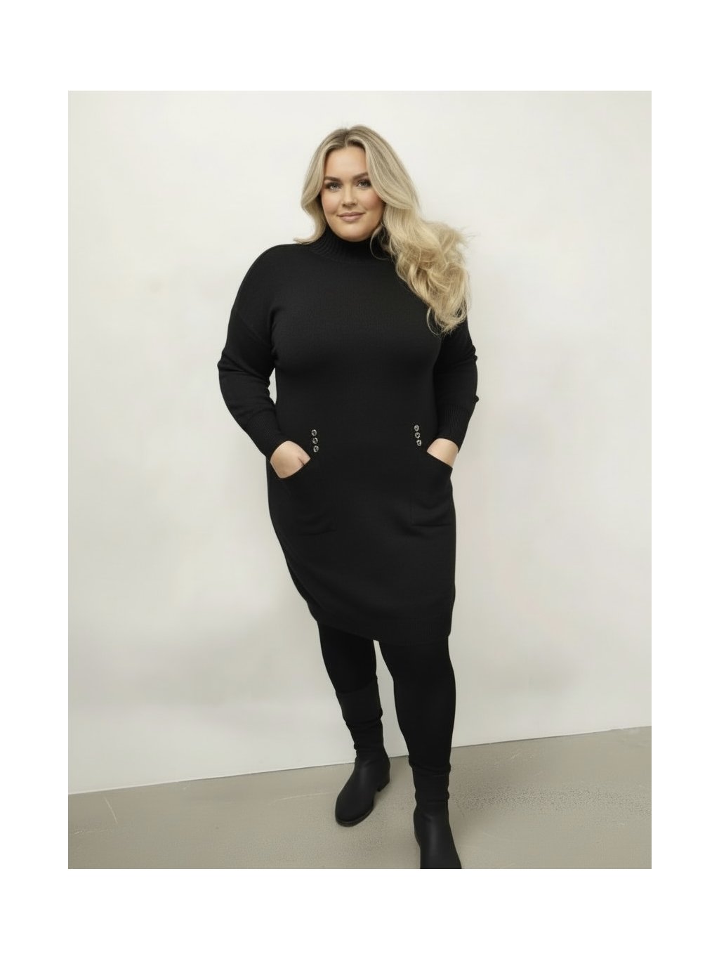 Modelka měří 167 cm a běžně nosí velikost 48,míry má hrudník 116 cm,boky 120 cm