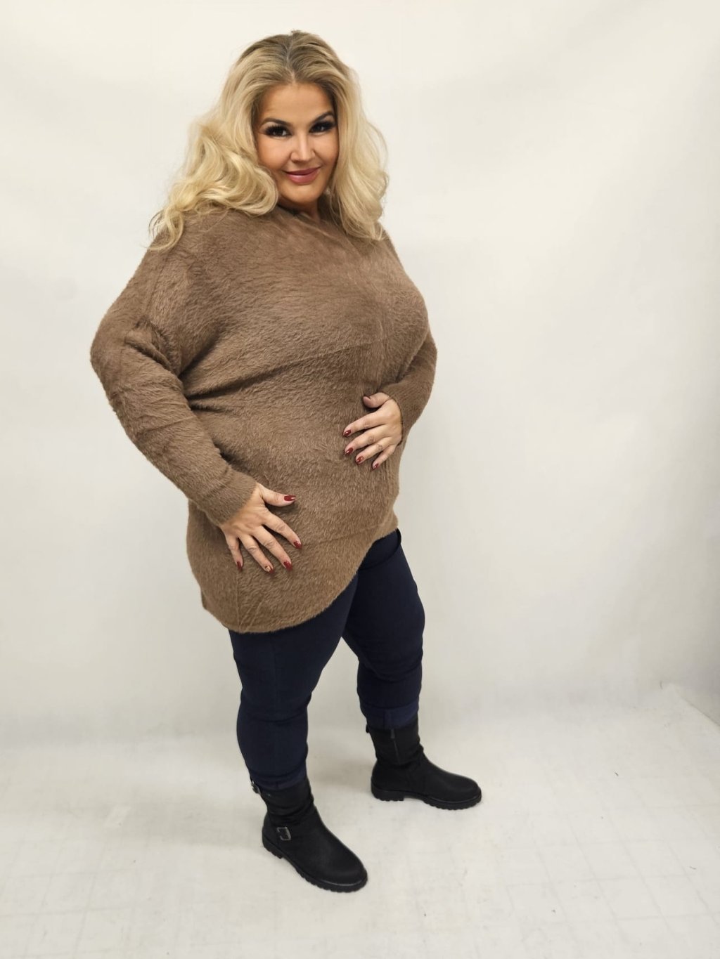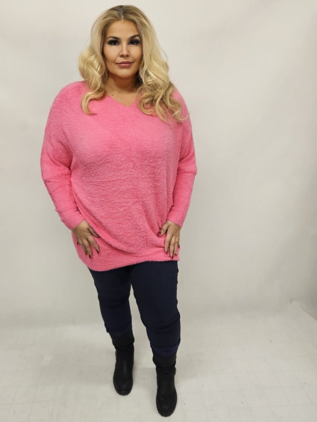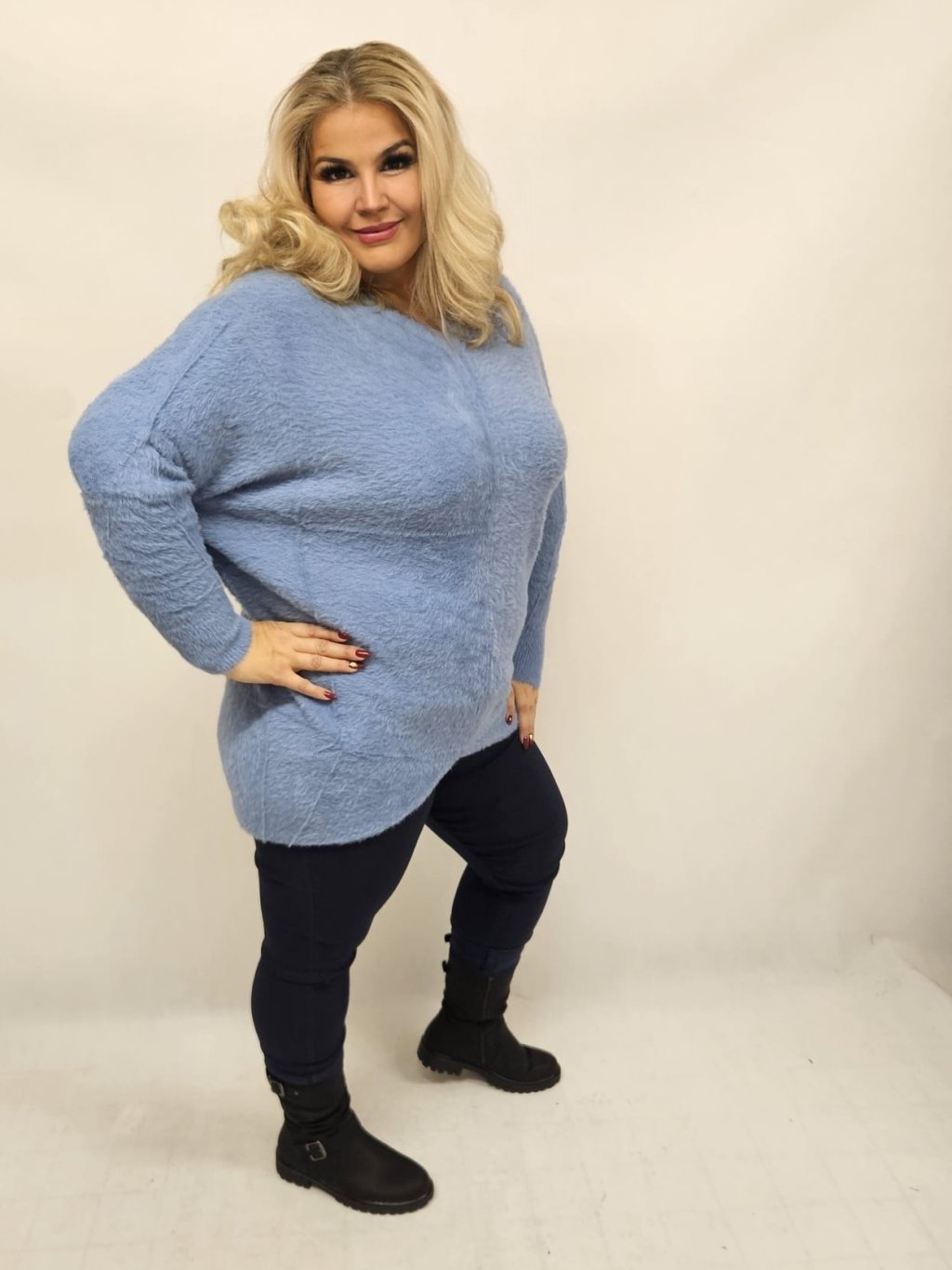 Tento delší svetr s jemným véčkovým výstřihem má vpředu lehce kratší střih, takže krásně padne přes kalhoty nebo legíny.