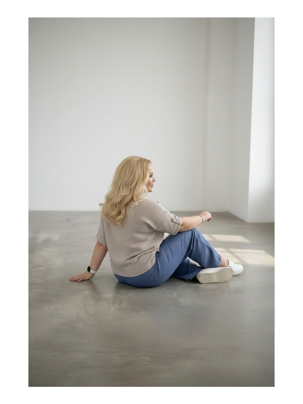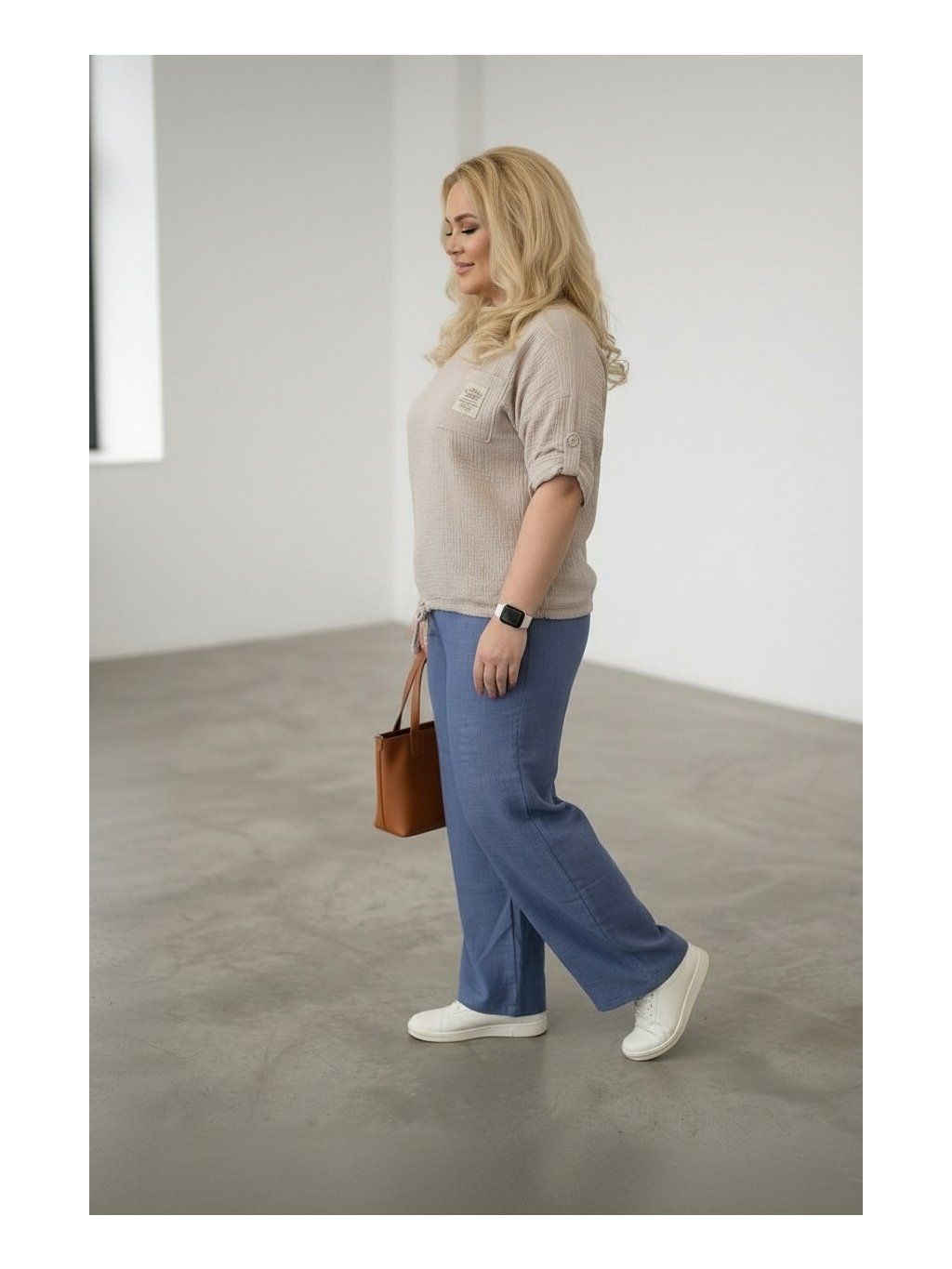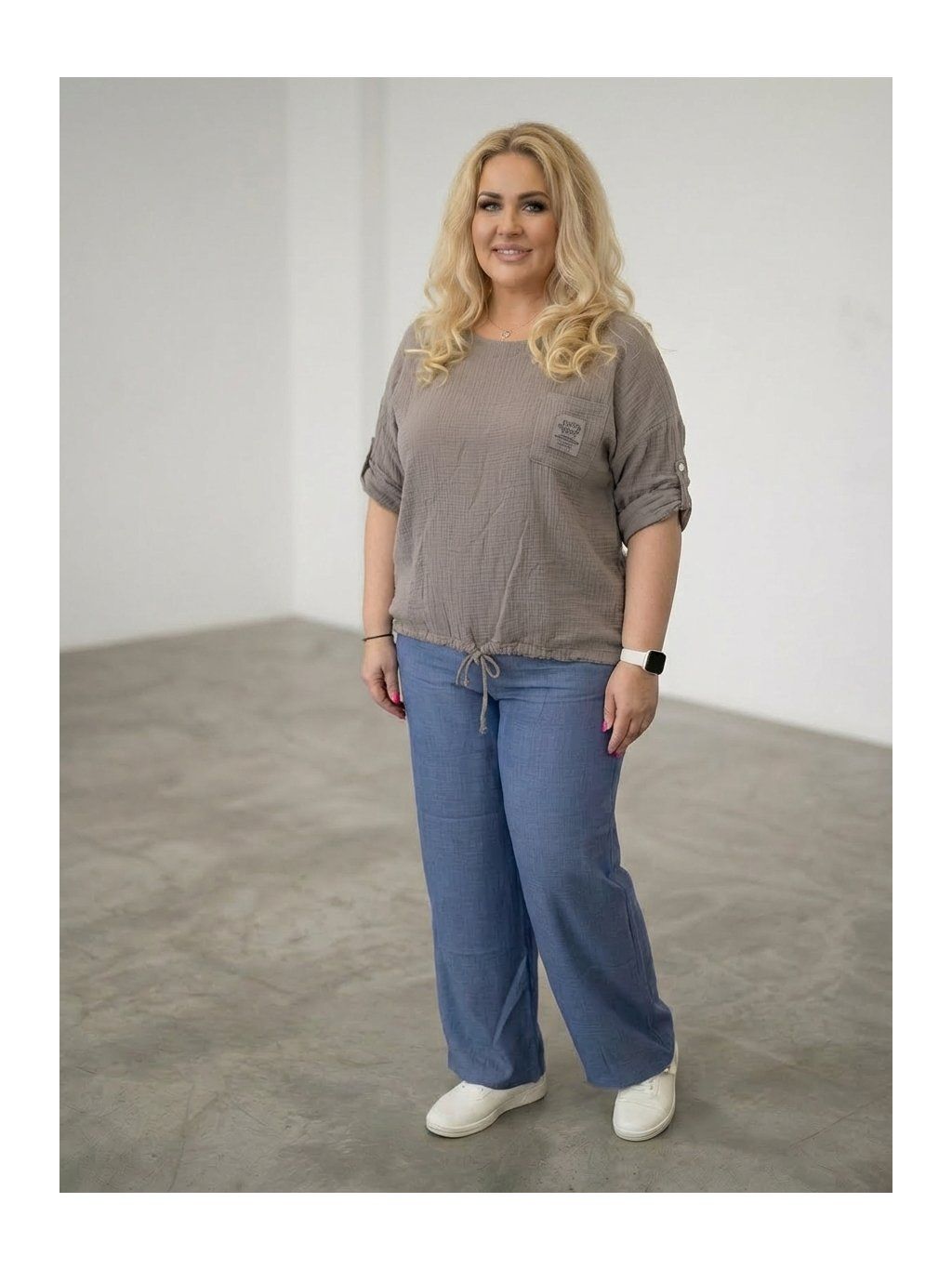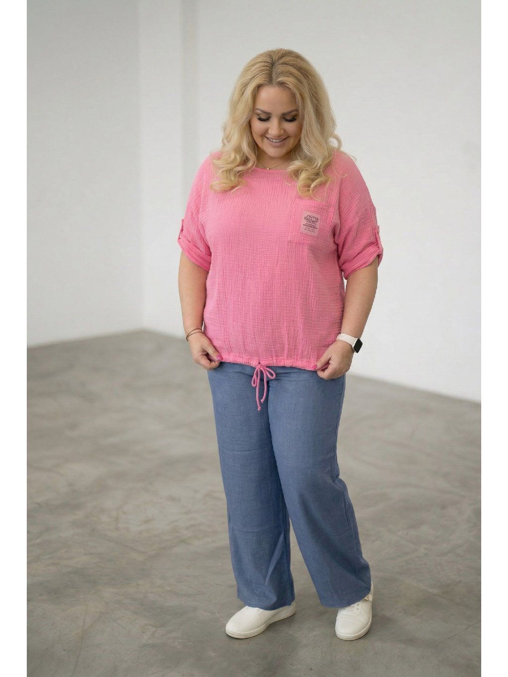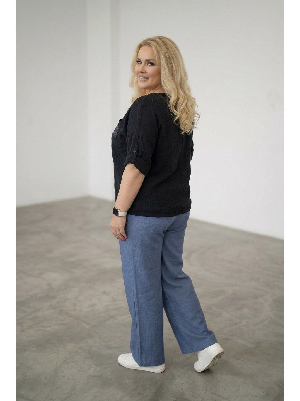 Modelka měří 167 cm a její míry jsou přes hrudník 124 cm a boky 126 cm